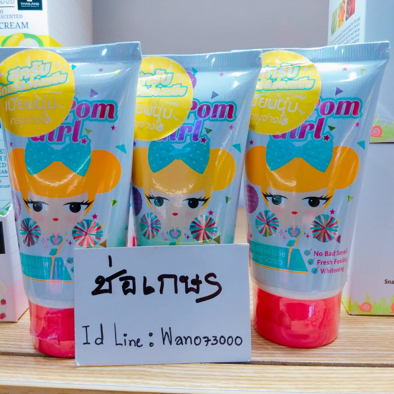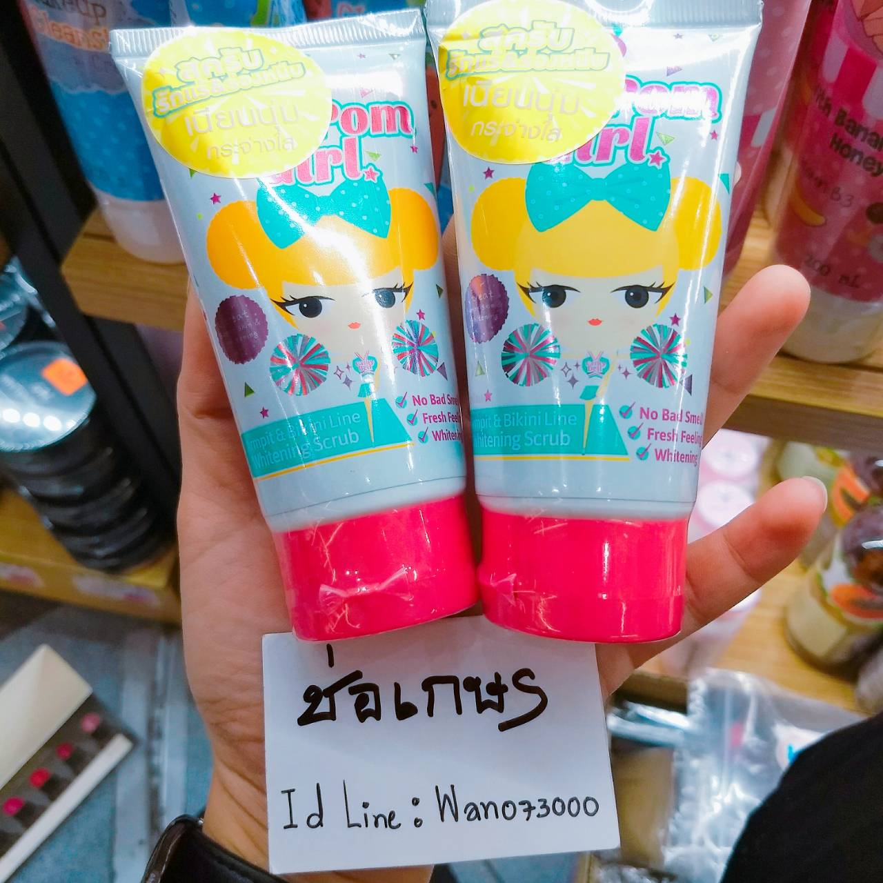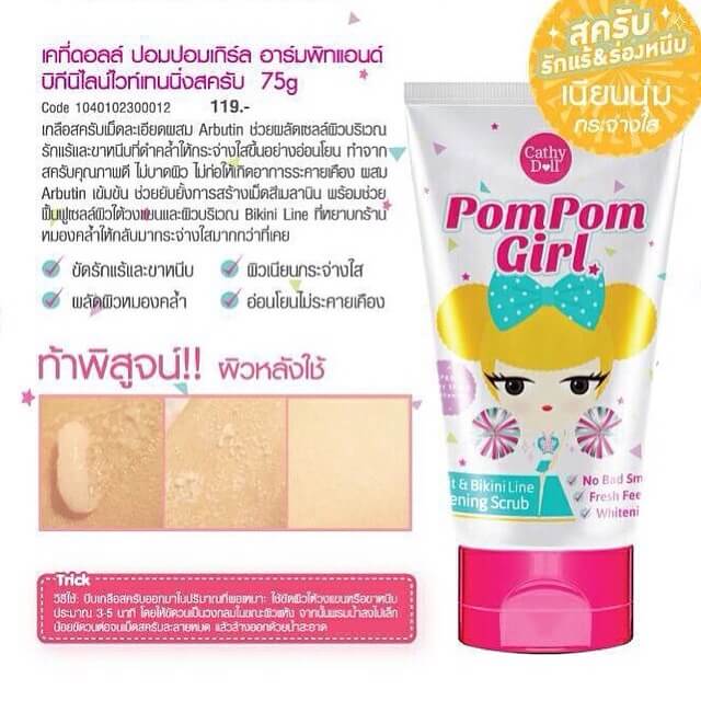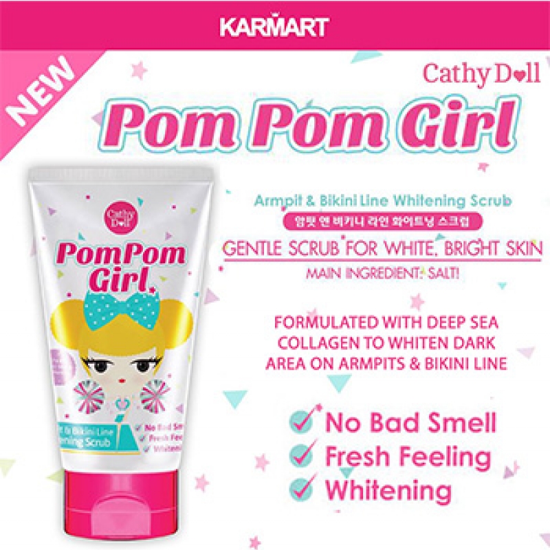 ราคาส่ง 12 ชิ้น 55 บาท Pompom Girl – Armpit & Bikini Line Whitening Scrub Cathy Doll เกลือสครับเม็ดละเอียดผสม Arbutin ช่วยผลัดเซลล์ผิวบริเวณรักแร้และขาหนีบ หมองคล้ำให้กลับมากระจ่างใสมากกว่าที่เคย Cathy Doll Pom Pom Girl Armpit and Bikini Line Whitening Scrub is the new technology from Korea combined with deep sea collagen helps to whiten the dark area around the armpit/ bikini line.It helps to improve whitening and lightening dark spot area easily and moisture back armpit skin tone.
